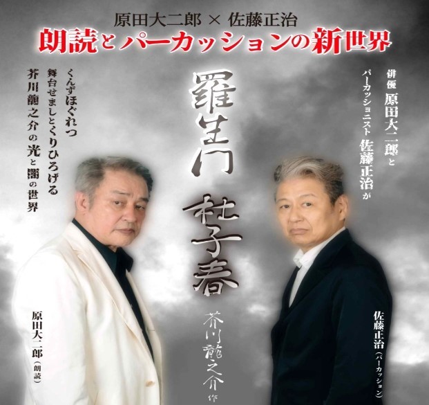 俳優「原田大二郎」とパーカッショニスト「佐藤正治」が、くんずほぐれつ、舞台せましとくりひろげる芥川龍之介の光と闇の世界。